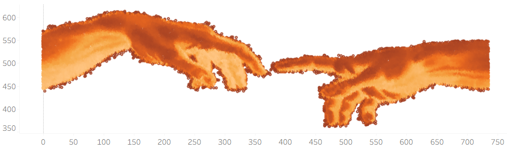 While not as pertinent to quantitative analysis, plotting images as scatterplots offers a delightfully creative output for Tableau. Python's computer vision library can be used to analyze an image and generate a csv with generated x, y, and intensity values