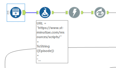 To account for this, I started with a generate rows tool in Alteryx to make a calculated column with all of the integers from 101 to 278, then connected the output to a formula tool to wrap these numbers into a generalized URL form.