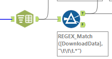 The text to column filter uses the new line character "\n" as its delimiter, to ensure that every row of its output is an individual line from one of the scripts. This expanded the previous 178 rows to approximately 566,000 lines. These were not all lines of dialogue though! The scripts from Star Trek Minutiae were full of stage direction and other background notes describing scenes. I noticed that the dialogue only seemed to be on lines with three tabs worth of indent, so I used a REGEX_Match formula within my filter tool to only retrieve rows that started with three straight instances of the tab character "\t". After removing these tabs, I had created one row for each line of dialogue from the show: