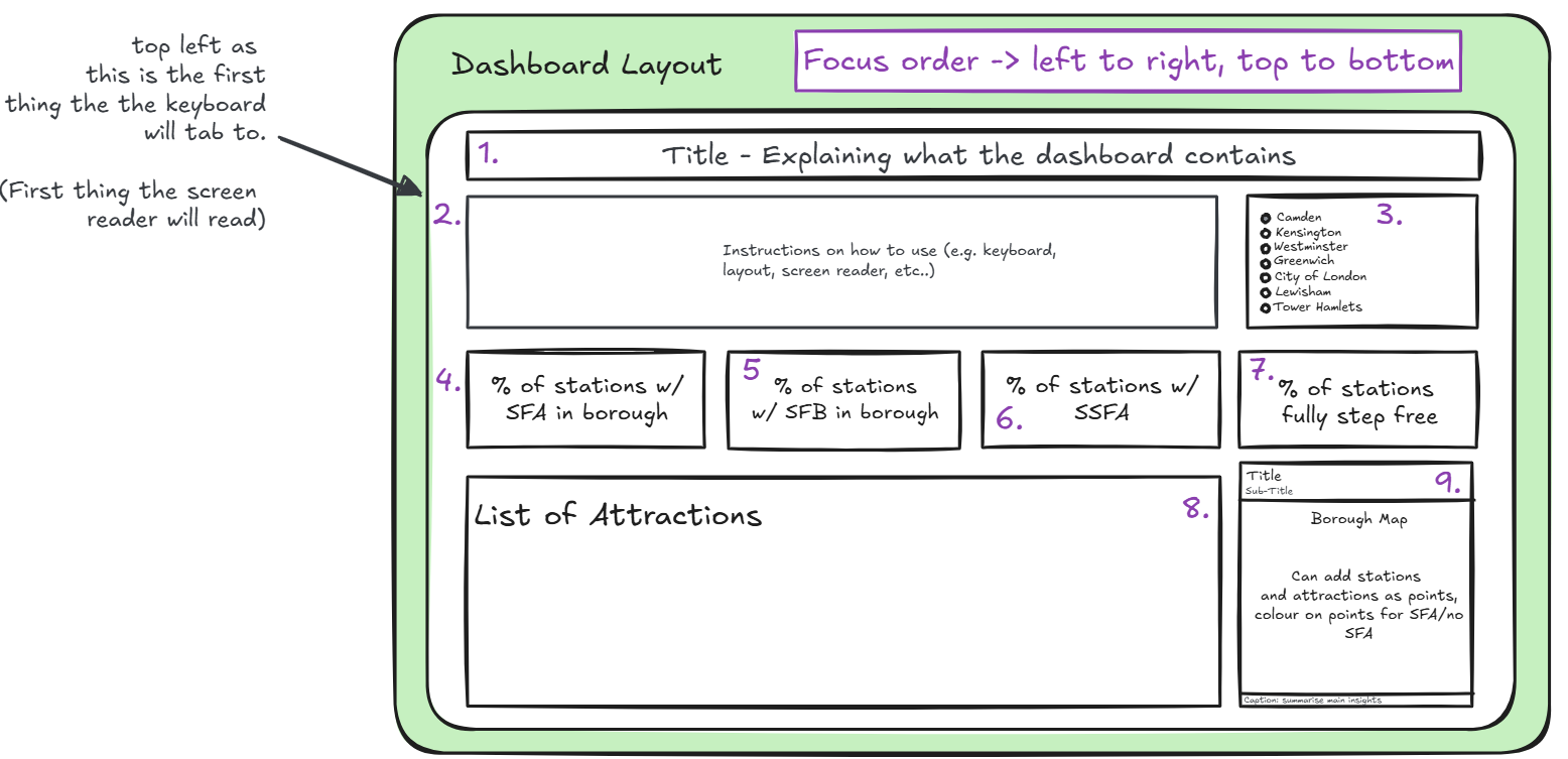 The task was to build a borough-level dashboard for Transport for London that highlights step-free station access, with filters for features such as toilets, lifts, and proximity to attractions. The dashboard needed to be screen reader–friendly, with clear text order, alt text for maps and KPIs, no inaccessible-only content, and keyboard shortcut guidance, ensuring a screen reader user could navigate and understand the key insights.