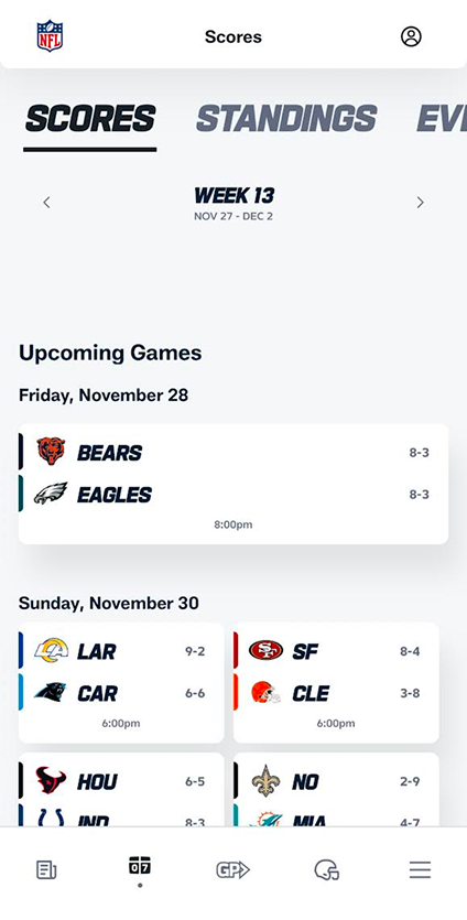 - Inspiration: The design was heavily inspired by the look and feel of the official NFL mobile app and website (see inspiration image below).