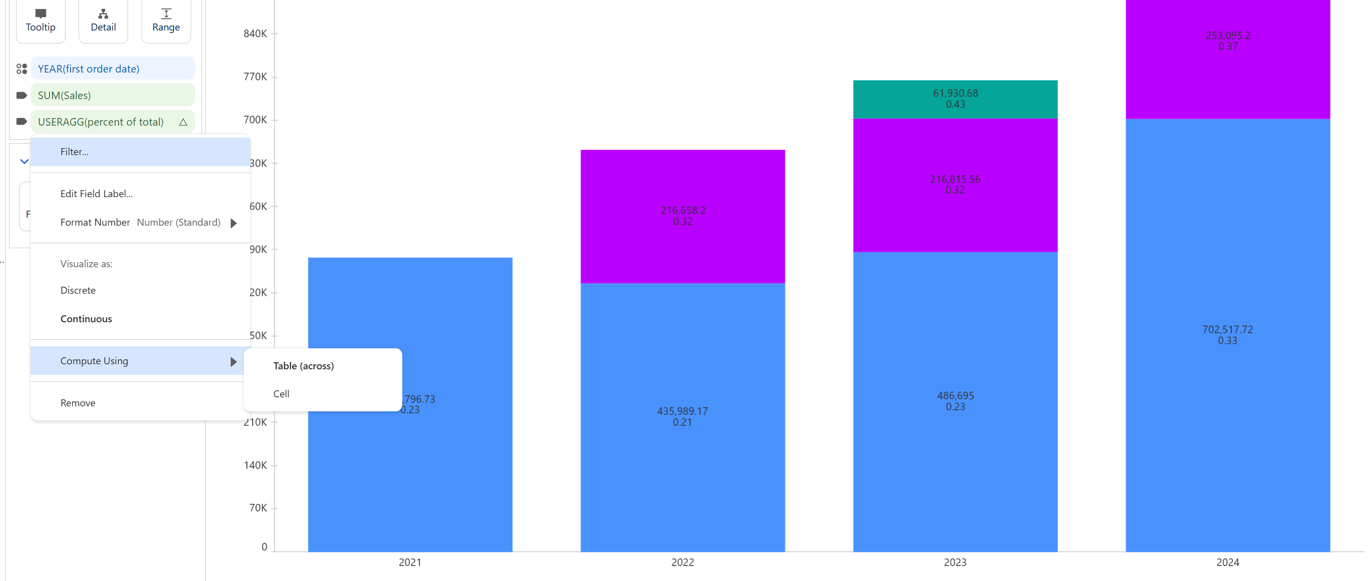 This calculation was placed on the Label shelf. However, the resulting percentages were incorrect. In standard Tableau, the "Edit Table Calculation" window allows you to define the scope and direction (e.g., "Compute Using: Table (Down)" or "Specific Dimensions") to ensure the calculation correctly divides sales by the total across the entire year.