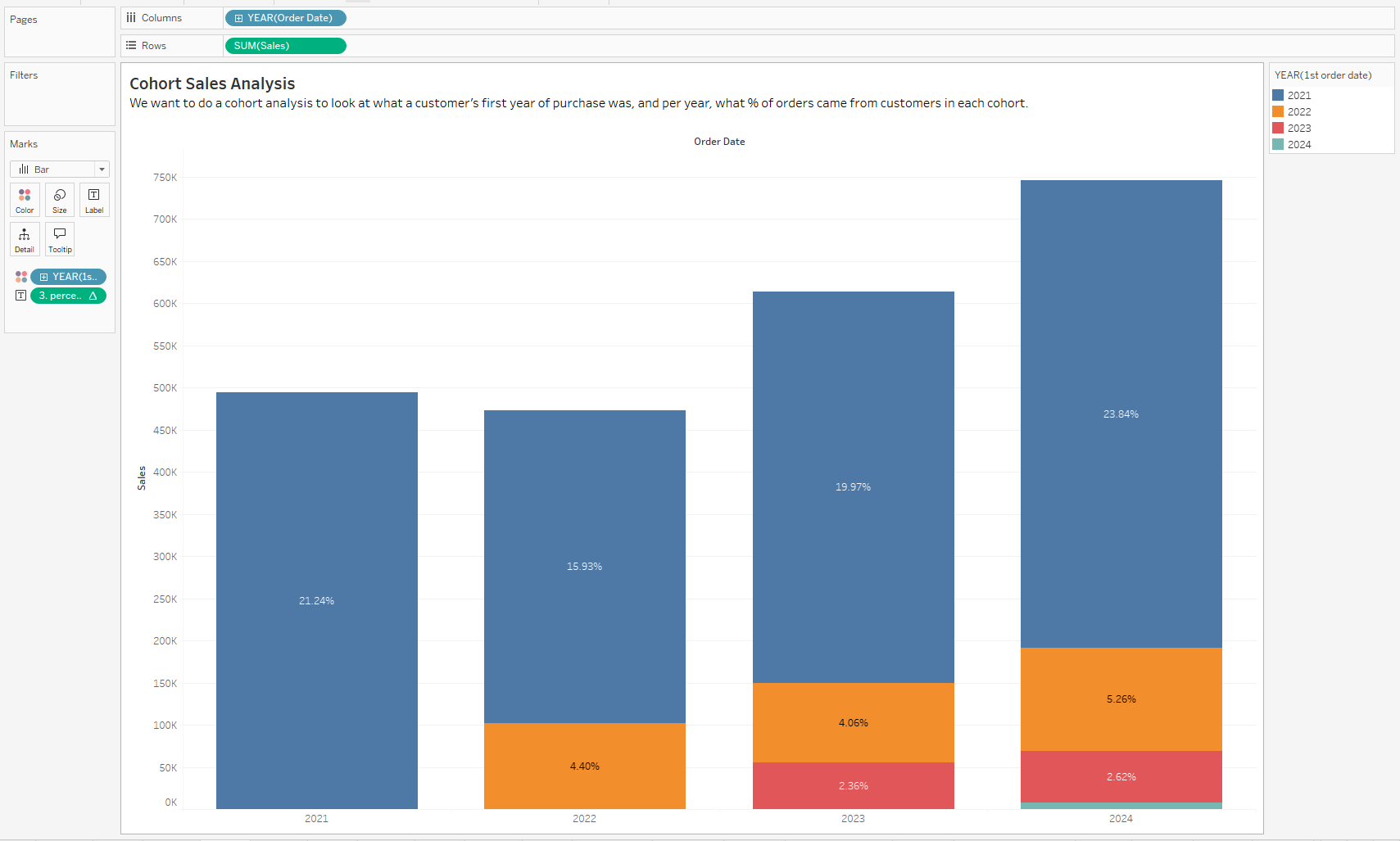 While exploring its capabilities, I attempted to build a common, complex visualisation: a cohort sales analysis. The goal was to show, for each customer cohort (defined by their first purchase year), what percentage of total orders that cohort accounted for in all subsequent years. (see the chart built in Tableau Desktop below)