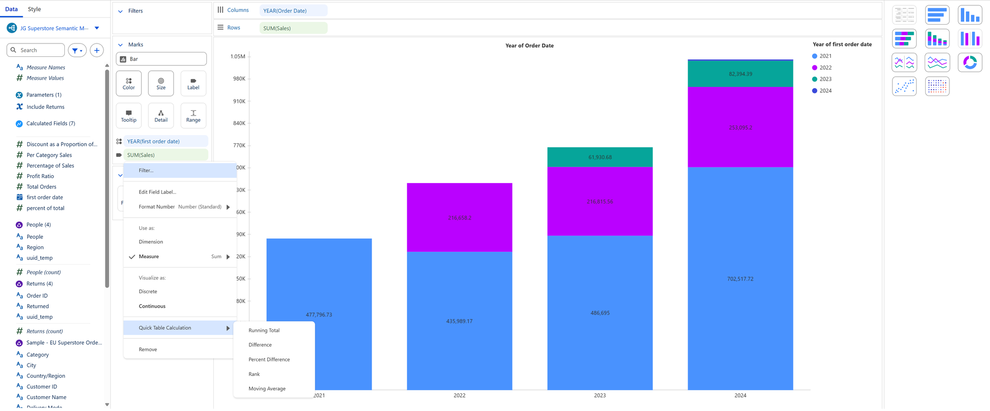The first step was defining the cohort year using a Level of Detail (LOD) expression. This calculation finds the minimum (first) order date for every customer.