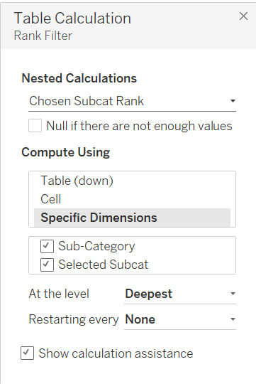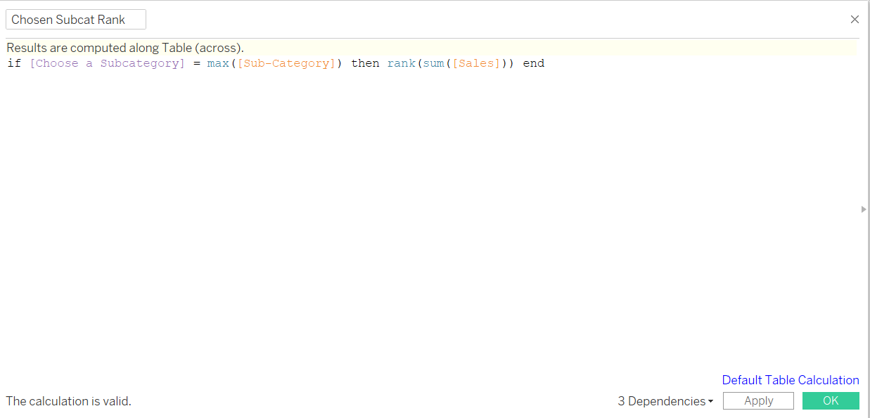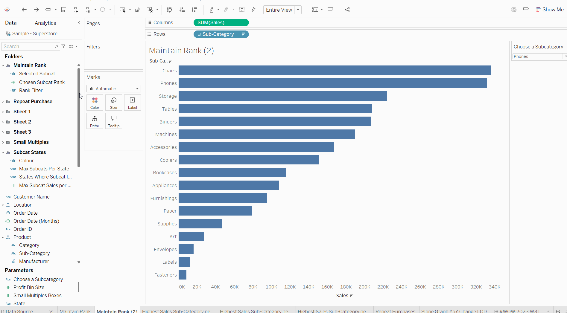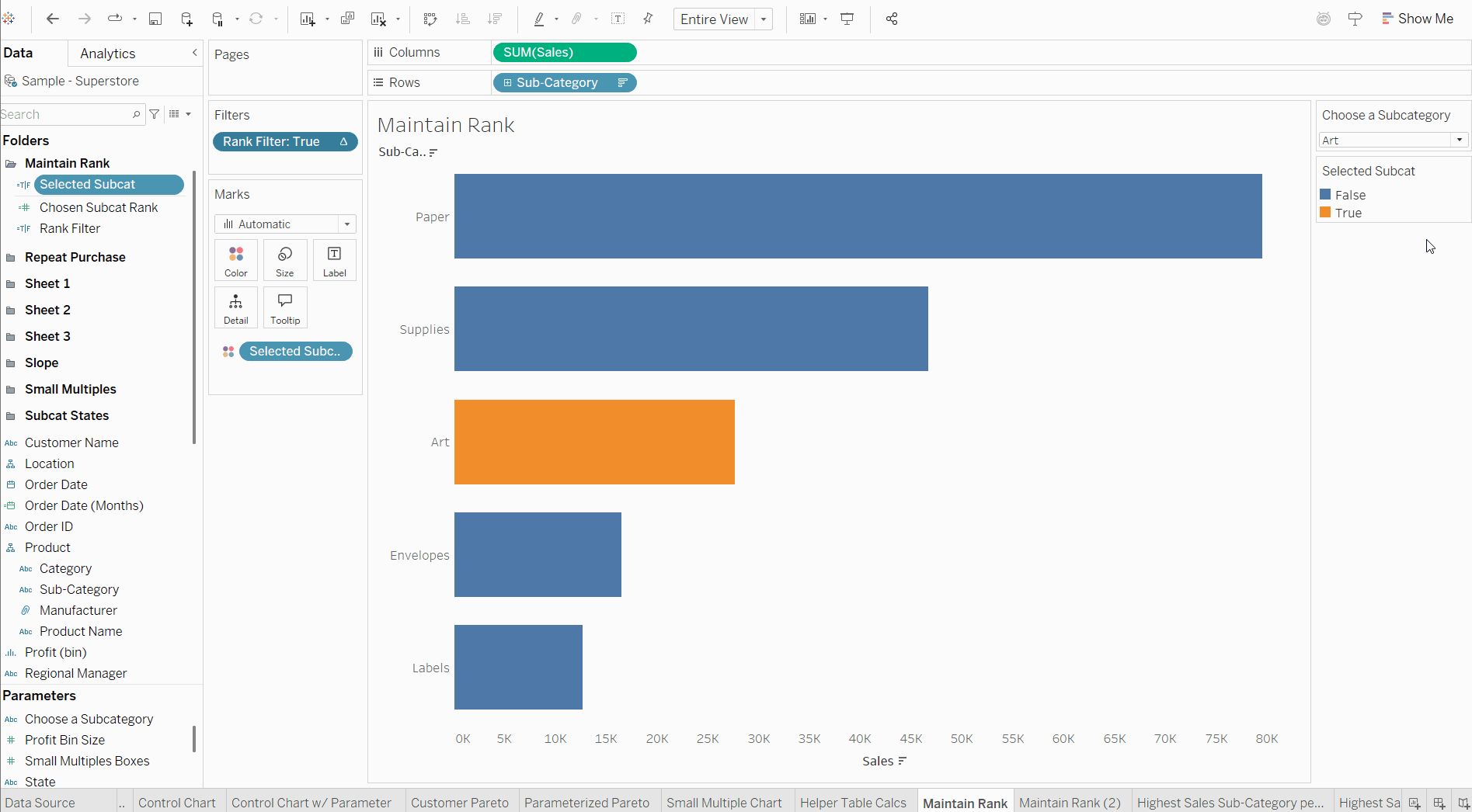 4) Now let's create a calculated field which will return the rank of the chosen subcategory.