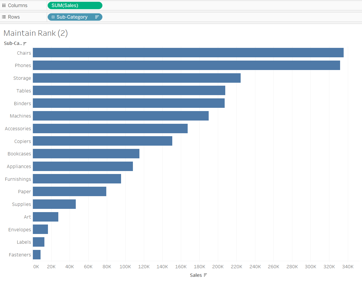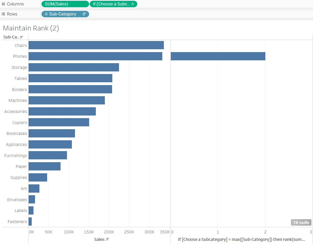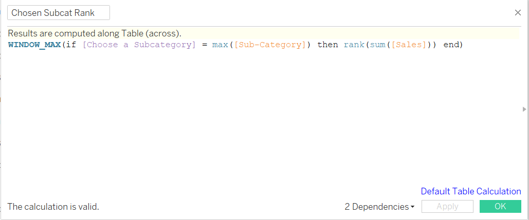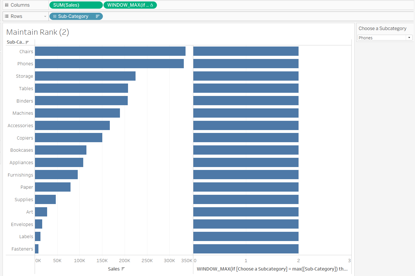 This only will return the rank of the chosen category for that specific sub-category. We want it to appear alongside every subcategory. To do this, let's wrap our previous calculation in a window_max function.