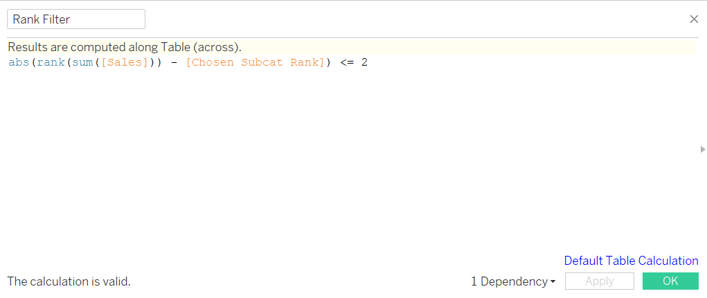 5) Now we need to make a calculated field to filter the view based on the rank of the subcategory. In this case, we want the absolute difference between the rank of our chosen subcategory and and the other to be less than or equal to two.