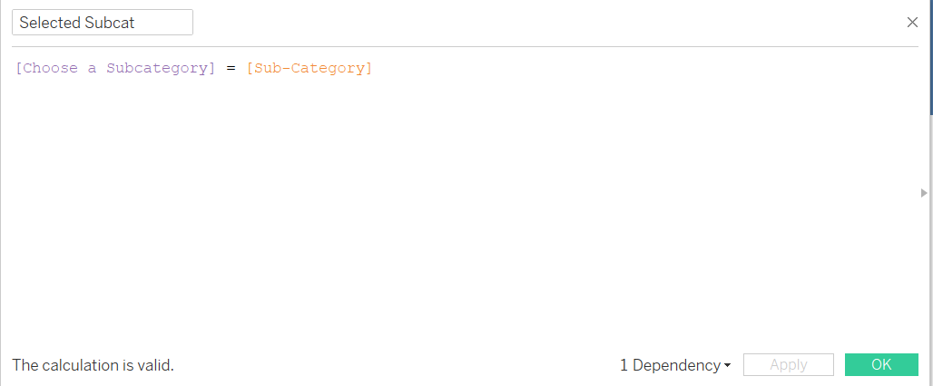 6) Finally we just need to create a calculated field to colour our chosen sub-category and alter our table calculation.