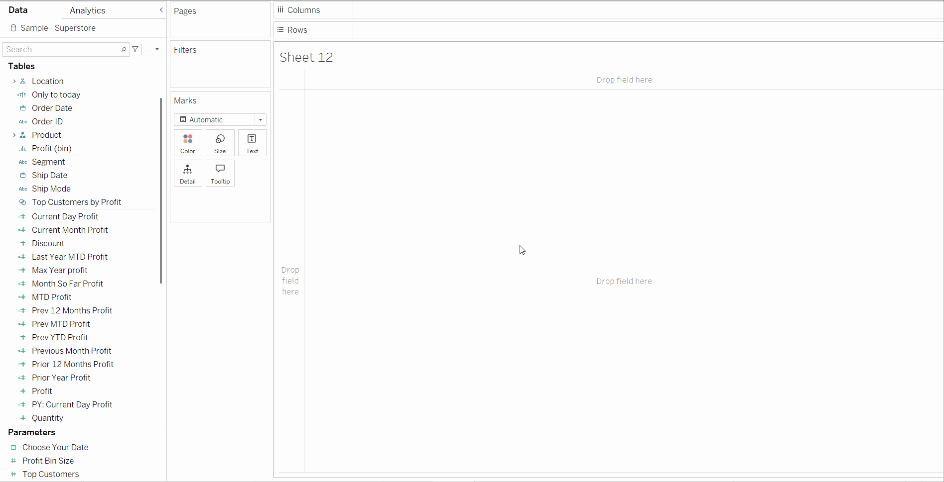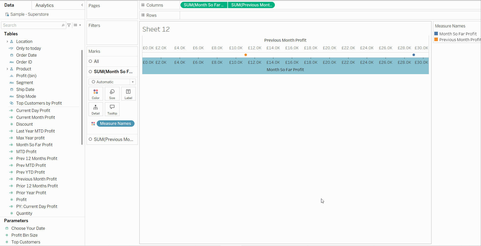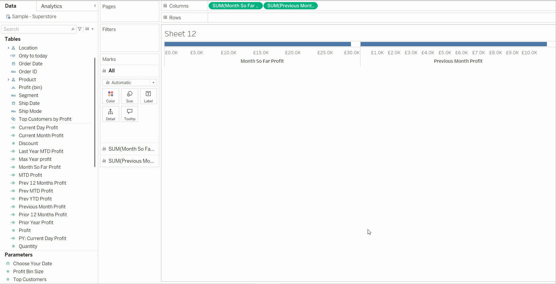 4) We can even go a step further and create a chart showing how much more profit we have to make to match last month's performance. Let's start a new sheet and drag our two calculated fields onto the columns shelf.