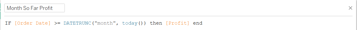 1) Let's start by creating a calculated field which will return the profit for this month up to today (i.e. the order date lies in between the 1st of the month and today).