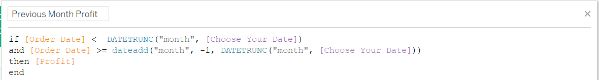 2) Then let's create another calculated field for the total profit for the previous month - return profit for all the dates that are greater than or equal to the 1st of last month and less than the start of next month.