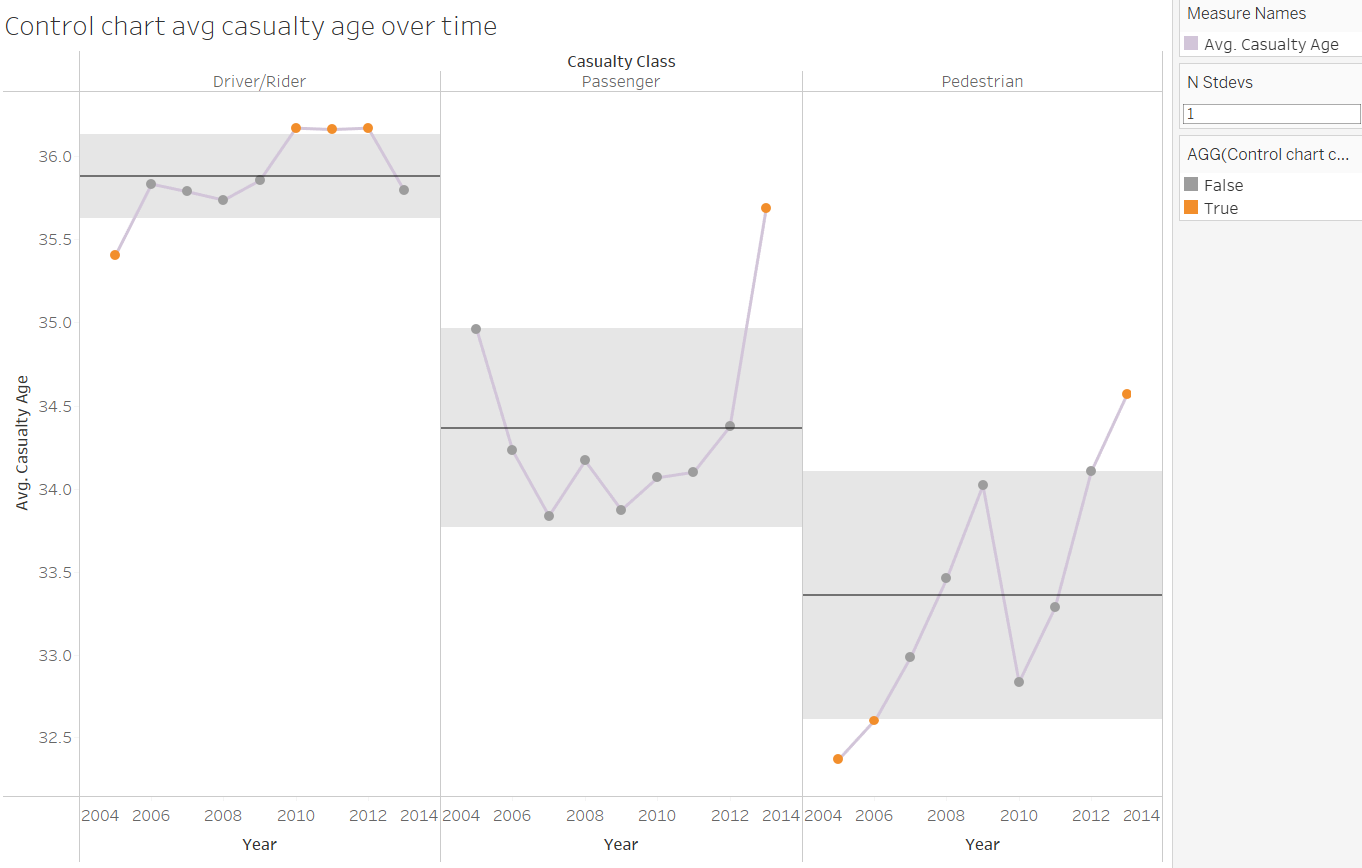 Here we can see how the average age of road-related casualties changes over time for drivers, passengers and pedestrians. Crucially, we can easily spot the years for which the ages lie more than one standard deviation above or below the respective means for each category (circles highlighted in orange).