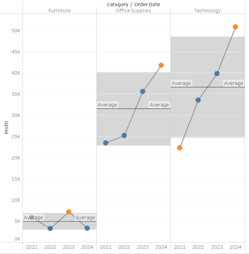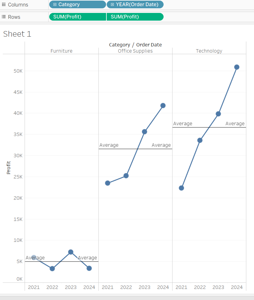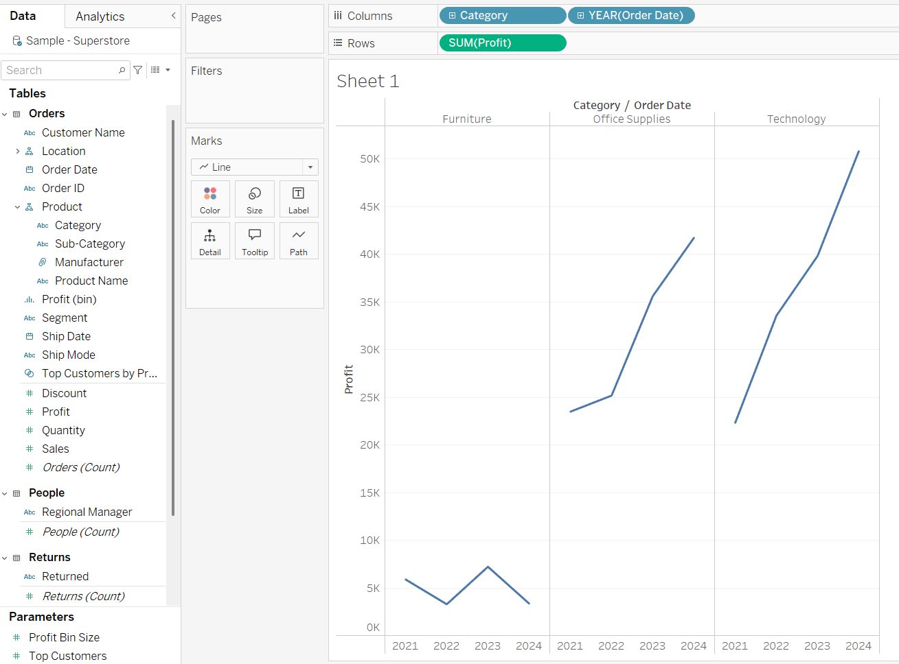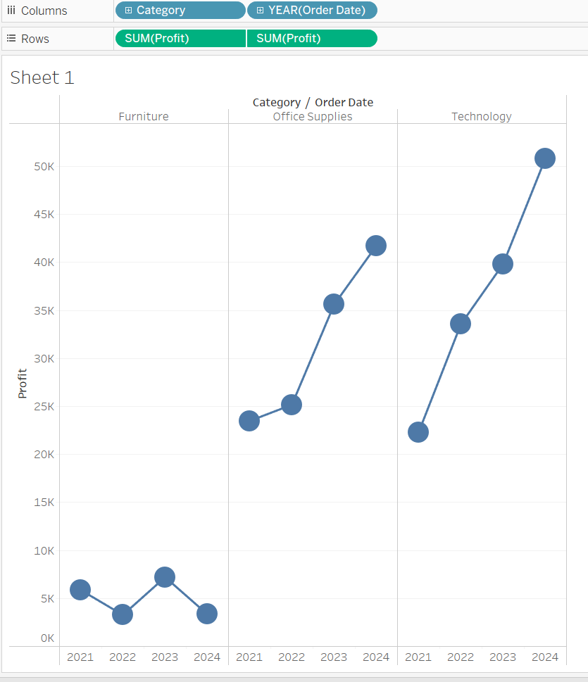 Step 1: Let's start by making a line graph showing profit over time for each category.