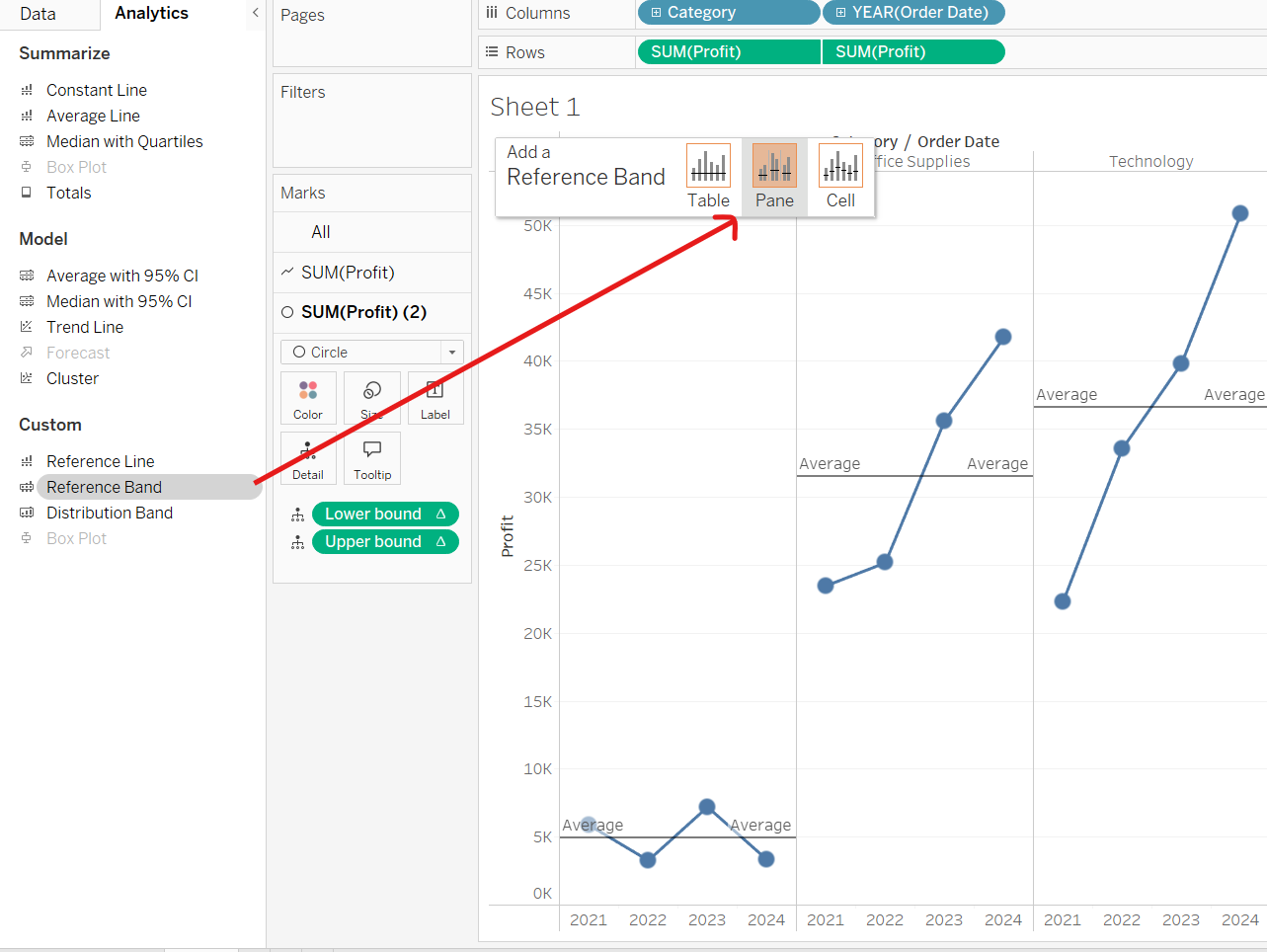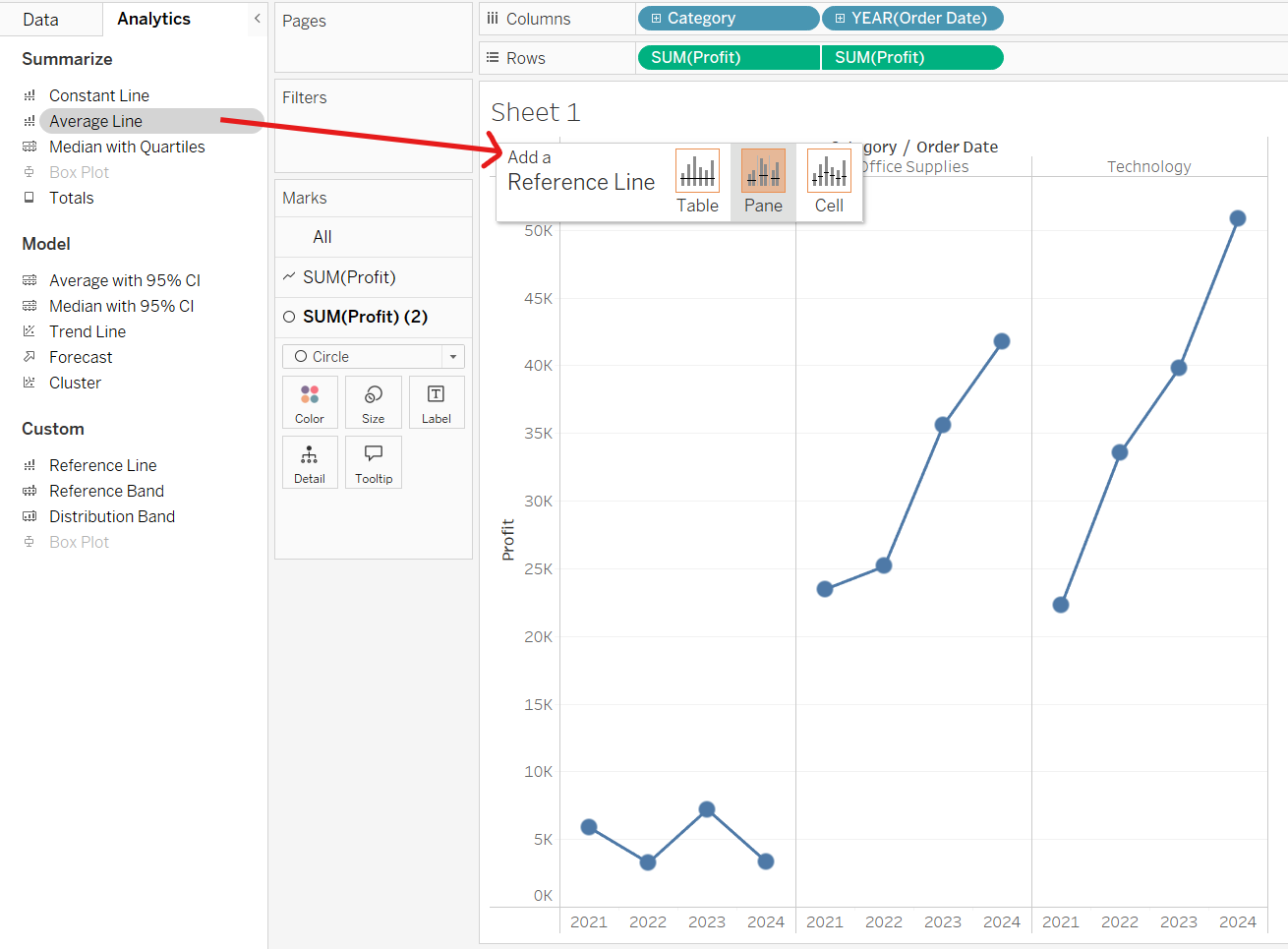 Step 3: Drag the average line from the analytics pane, selecting 'Pane' so that we get a separate average line for each category.
