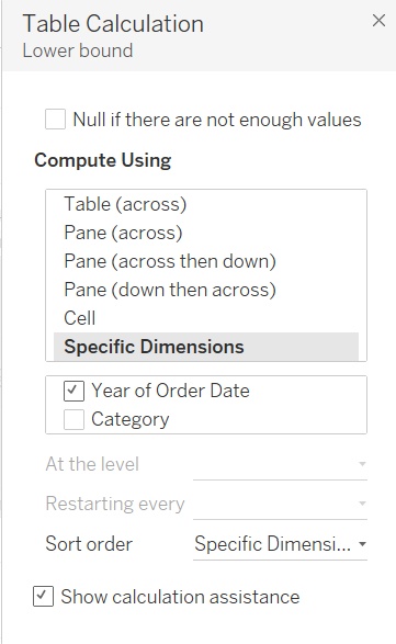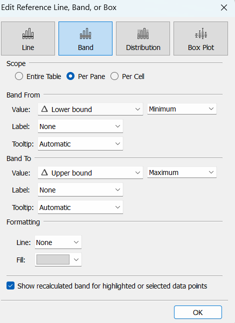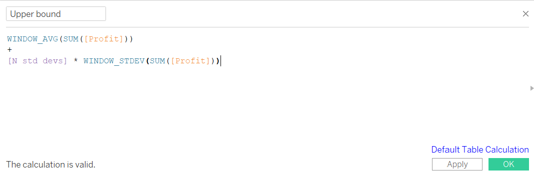 Step 5: Create calculated fields for the upper and lower bounds of reference band. Note: we use window functions here because we want these to be calculated for each category in the view.