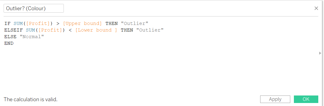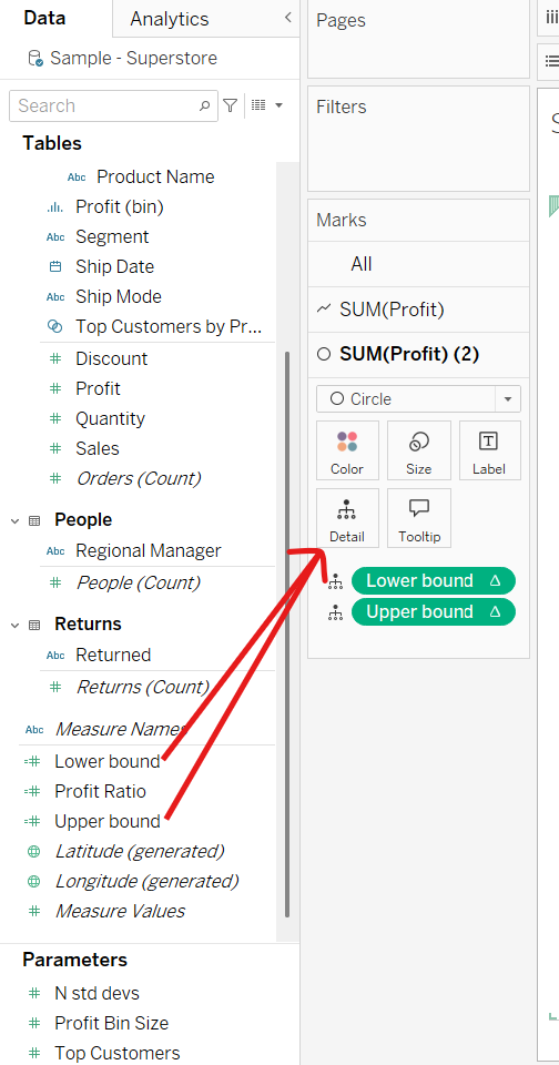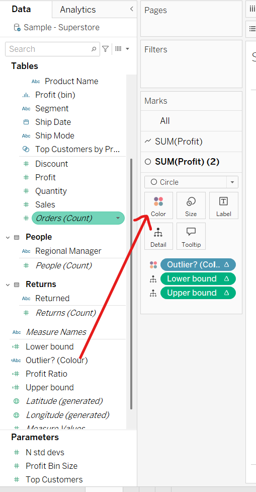 Step 7: Almost there! Next we'll colour the circles which fall outside of our range of standard deviations. Create a calculated field which will determine whether the point lies within our reference band or not and then drag it onto the colours shelf.