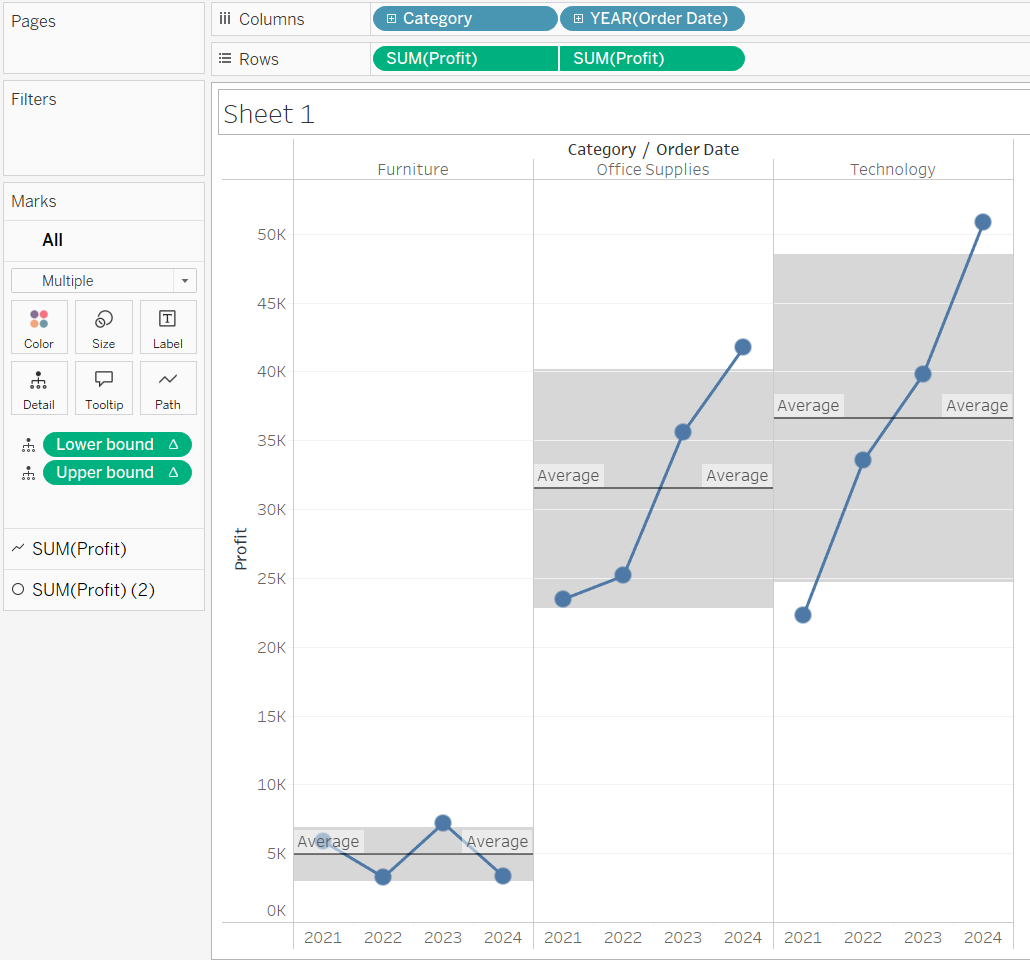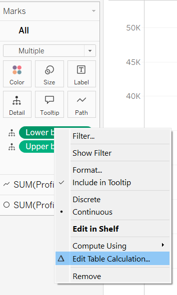 Step 6: Drag your upper and lower bound fields to the details shelf, change both of the table calculations to be computed using year of order date and then add your reference bands.