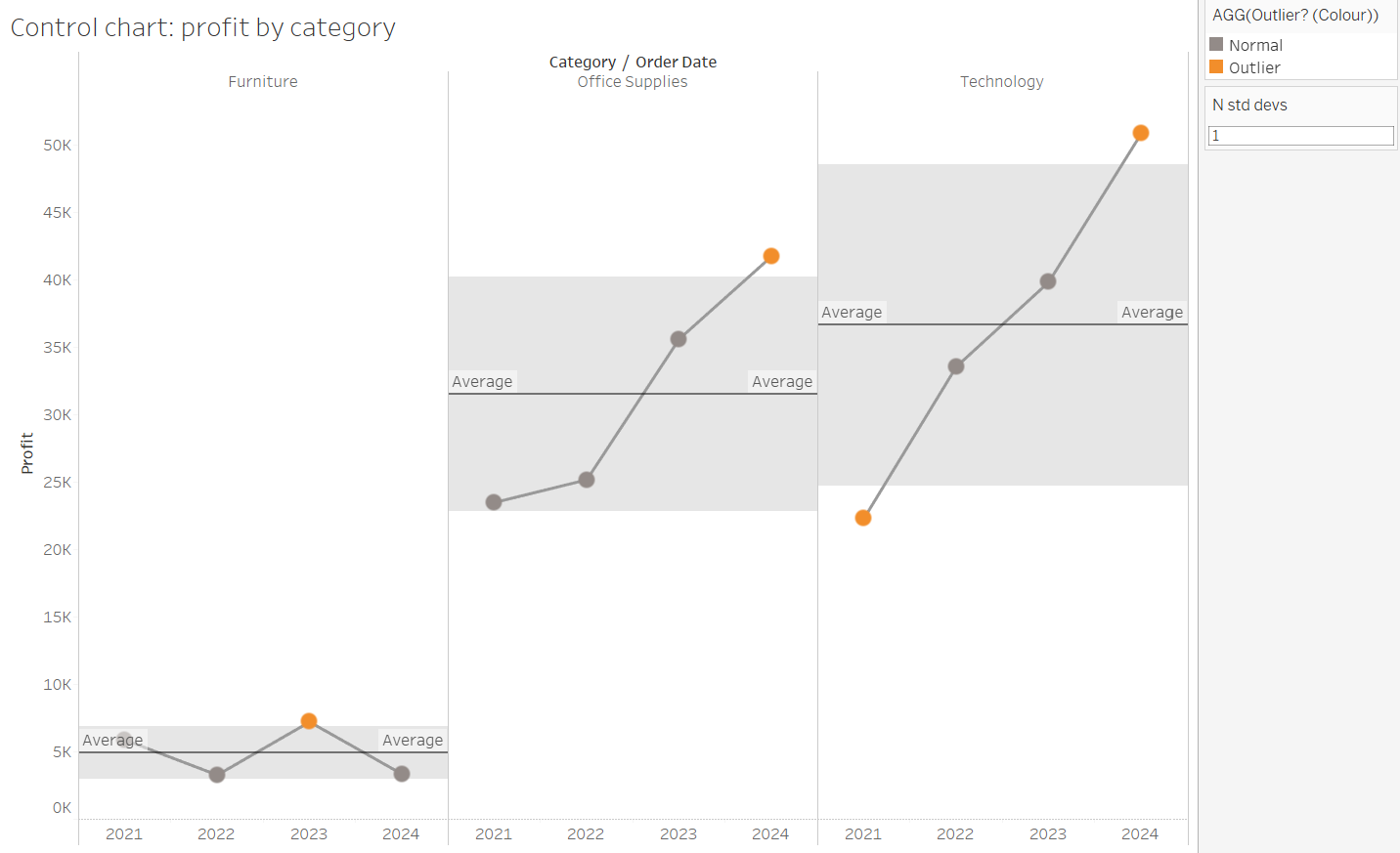 Standard deviation is a measure of the spread of a data set from its mean. Control charts display standard deviations above and below the mean in the form of a reference band to clearly highlight any anomalous records.