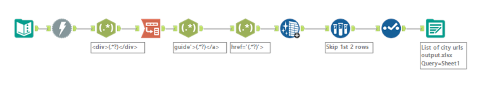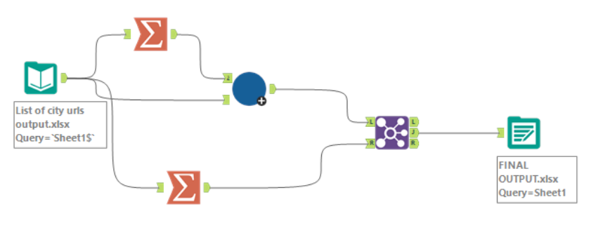This process involved three workflows, one being a batch macro, with the first one producing an excel sheet with a list of urls for each city.