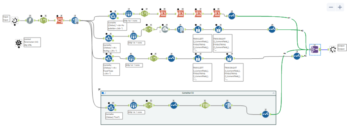 As the brief involved using Power BI, I attempted to use Power Query for the first html link containing all the cities, their backpacker index, and their respective html links. The index table was pulled through but the html links were being returned as strings. At this point, I changed tact and switched to Alteryx where I proceeded to test my regex and batch macro skills.