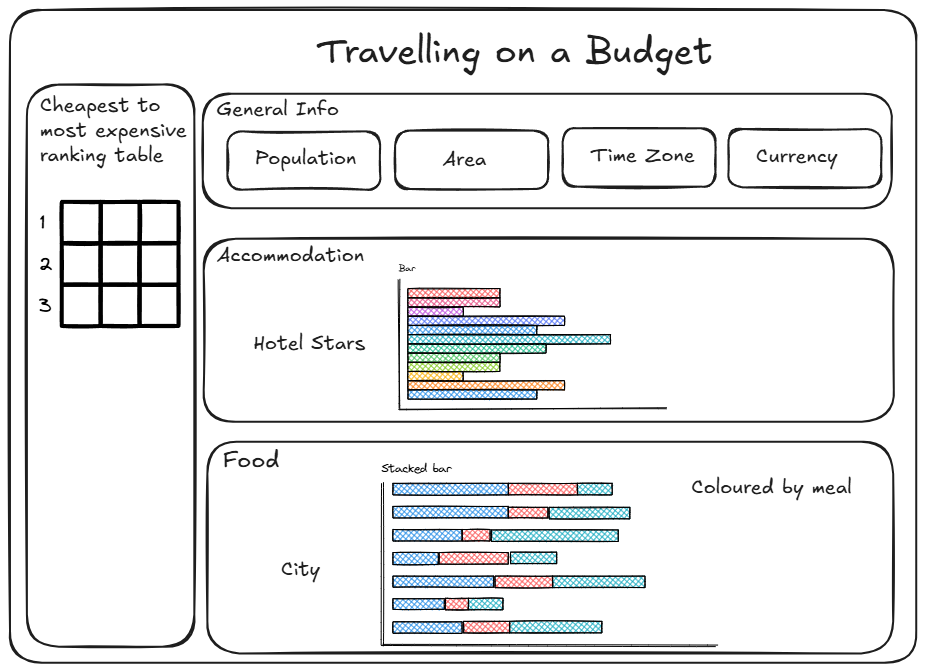 Additionally, I thought the use of a batch macro would speed things up but proved more difficult than anticipated resulting in less time available for making the final dashboard. Below is a sketch of said dashboard and as mentioned previously due to the data structure the accommodation section would have to be split by city not hotel stars.