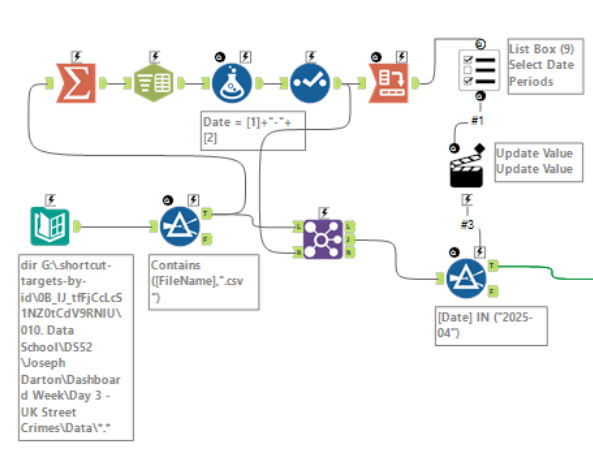 With the list box providing the available dates present in the dataset the user is able to filter to the required files drastically reducing the amount of data that needs to be loaded into Alteryx. However, a date interface tool could have been used for a more user friendly experience but I decided against this in case the user selects dates that are not present in the dataset.