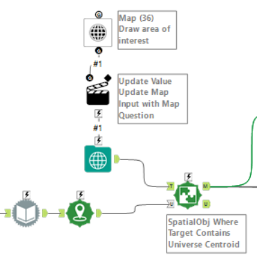 Within the dataset, we have latitude and longitude values which we can make into points. Doing so will allow us to use a spatial match tool to check if the points in our dataset fall within the user-selected area on the map. If they do they are passed through to the final part of this workflow.