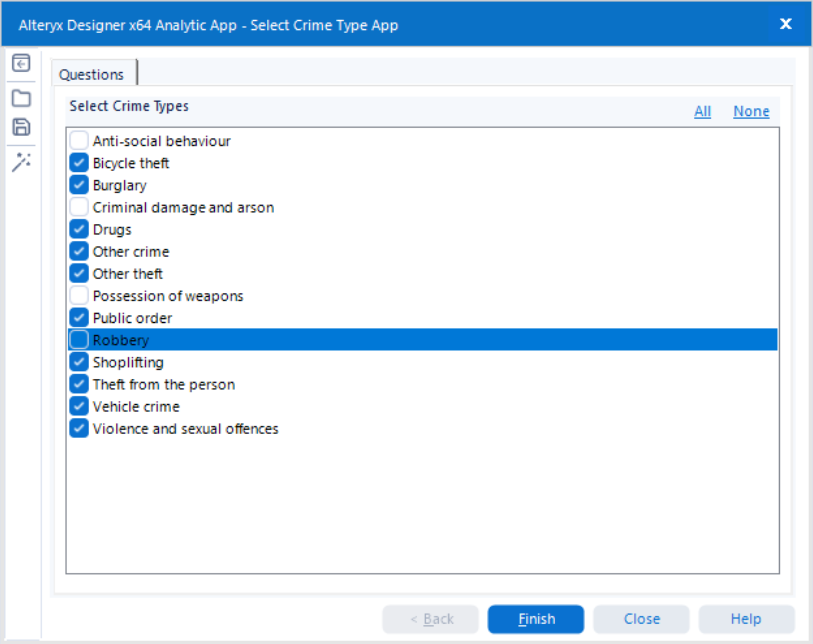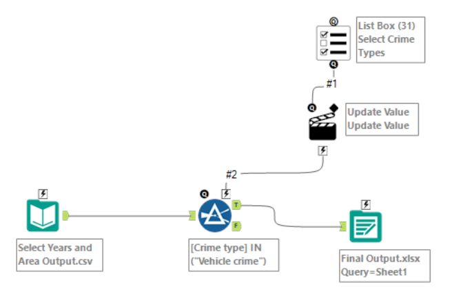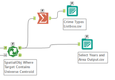 In this last part, the crime types that apply to the dataset filtered down by dates and area are summarised as a list to be inputted into another list box in the next Alteryx app. The dataset here is outputted to then be used as an input in the next app in our chain.