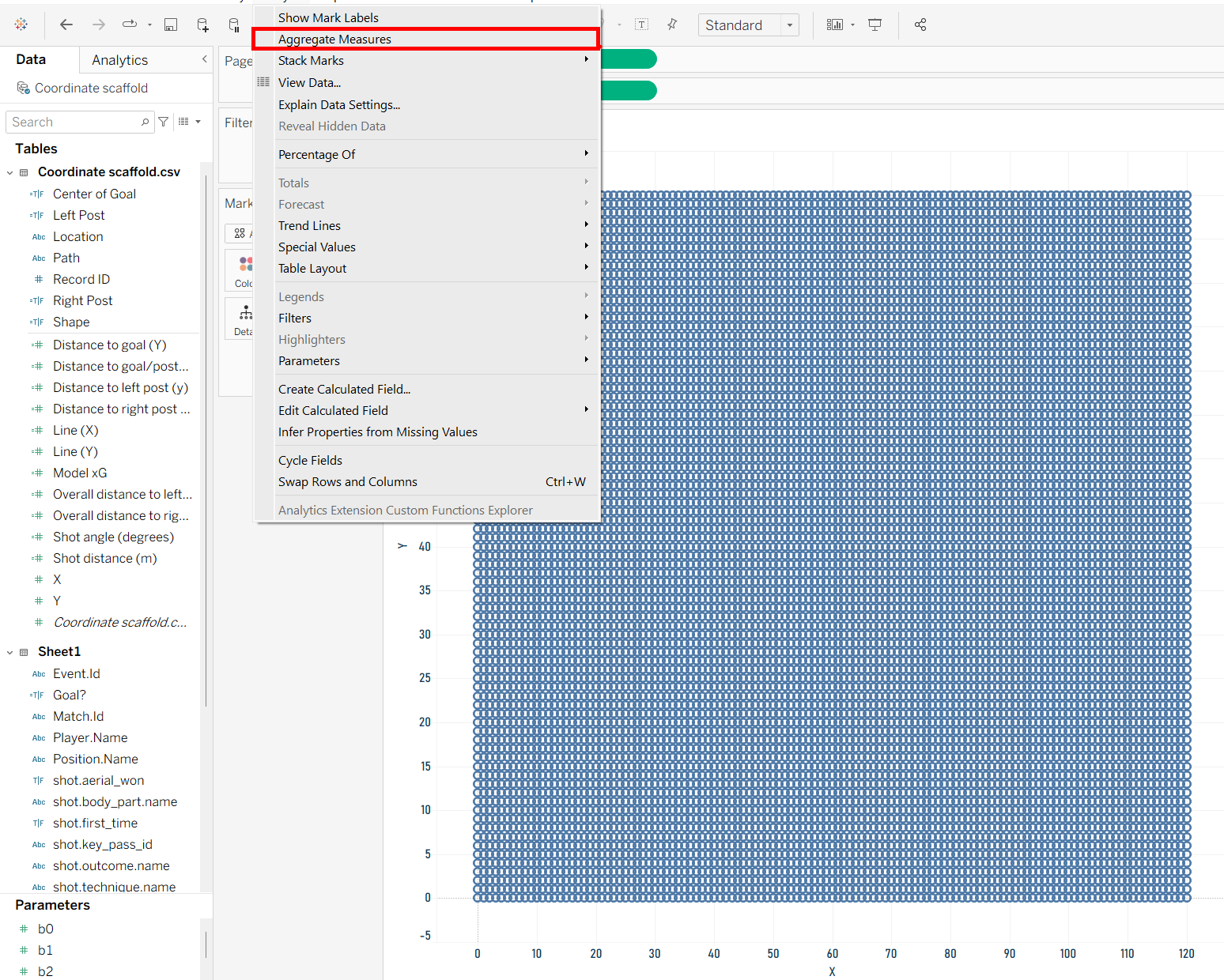 Now that we have the data it's time to start plotting our coordinates in Tableau using the pitch diagram provided by StatsBomb. To start we are going to put our X field onto the column shelf and our Y field onto the row shelf. After doing so make sure to go onto the analysis tab and unselect the aggregate measures option and you will get a grid of marks.
