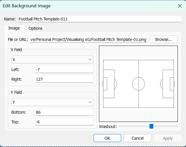 Next, we want to plot these points onto a background map of a pitch. Select the map tab and click on background images to add your pitch diagram. The exact bounds may vary depending on if your image has some sort of border around it but if basing it off the StatsBomb diagram they should be around the same values as shown below.