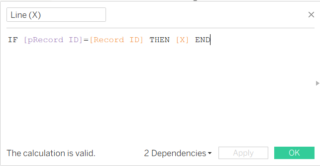 We can now create our lines that will only appear for the point the user has selected. Create calculated fields using the X and Y fields to only return the data associated with the selected point.