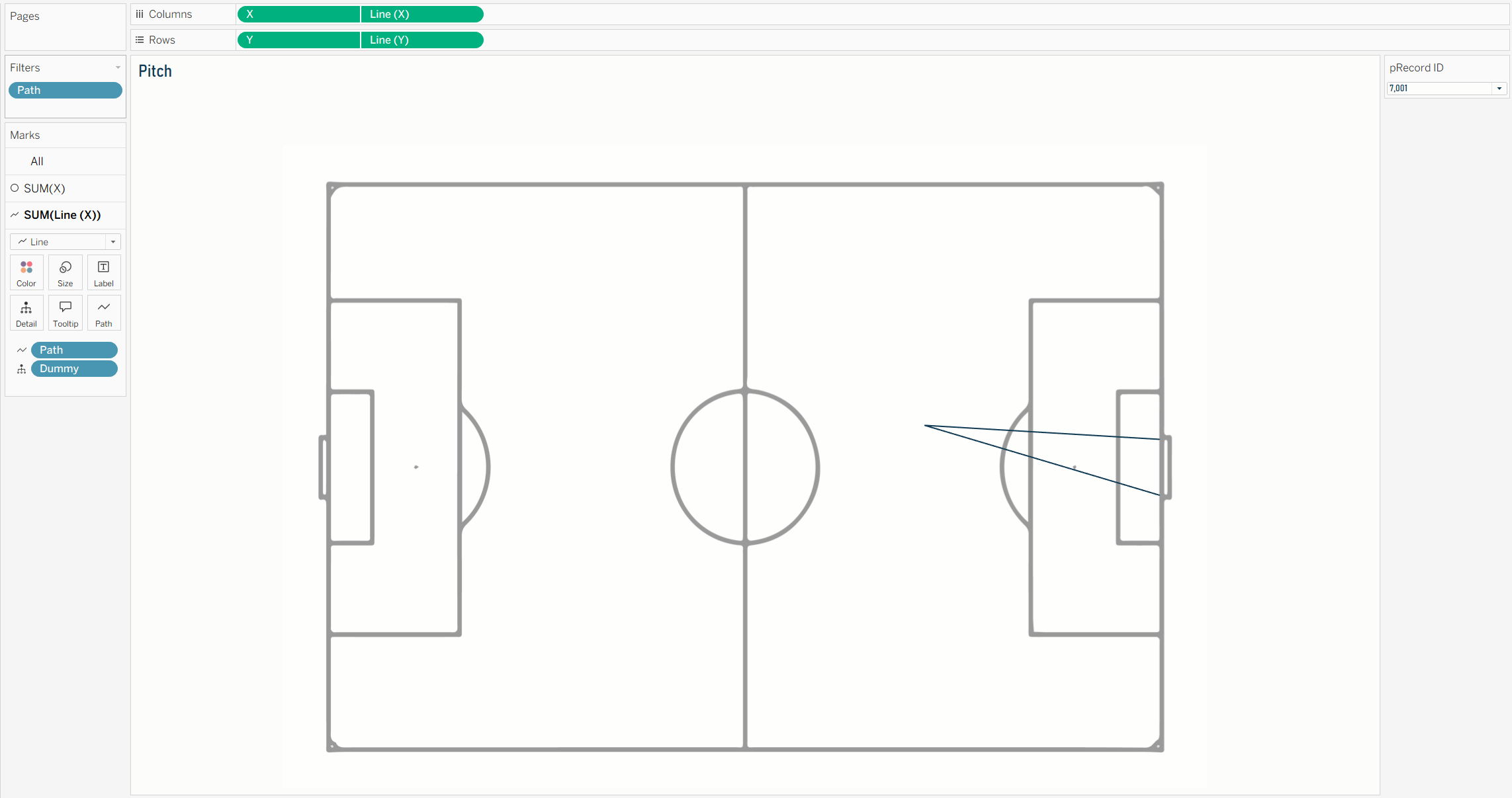 Then drag these two new fields next to their corresponding original fields on the column and row shelfs and turn them into dual axes. We now have a second mark that we can turn into a line and drag path onto the path card. This will now draw lines from the point to the left and right post of the goal (I decided to filter out the line from the point to the middle of the goal).