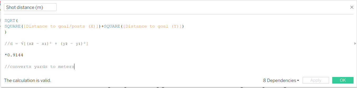 With that out of the way, we need to use trigonometry and Pythagorean theorem to calculate our distances and angles between our points. Our model will be using distance in metres while our coordinates based on yards so distances will need to be converted. With d as our shot distance we need to replicate the following formula in Tableau:
