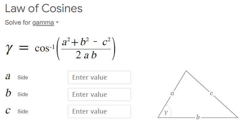 To calculate our angle we will need to use a variation of the cosine rule as shown below: