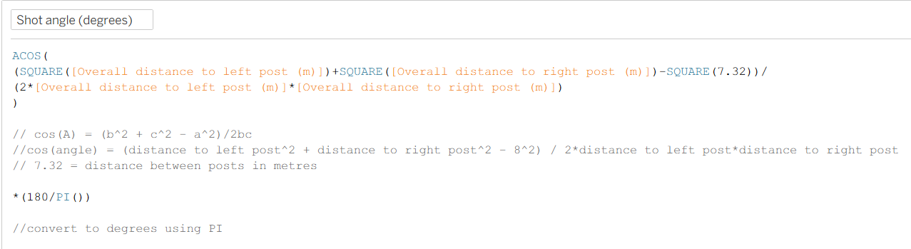 In this situation side a would be the distance to the left post, b would be distance to the right post and c would be the distance between the posts. The distances to the post are calculated with the same logic for our calculation of the shot distance and the distance between is simply 7.32 metres. Our final calculation then looks like this: