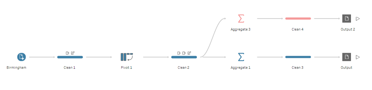 A learning opportunity arose when I was tasked with creating multiple outputs from a dataset. I initially created two separate flows before realising you can branch off from each step in the flow to be more efficient and have less files cluttering the computer. These flows allows for common cleaning procedures to be repeated for future datasets.