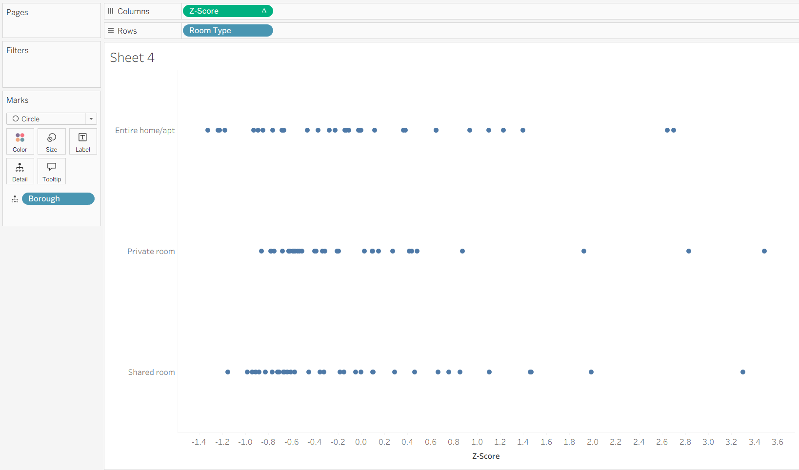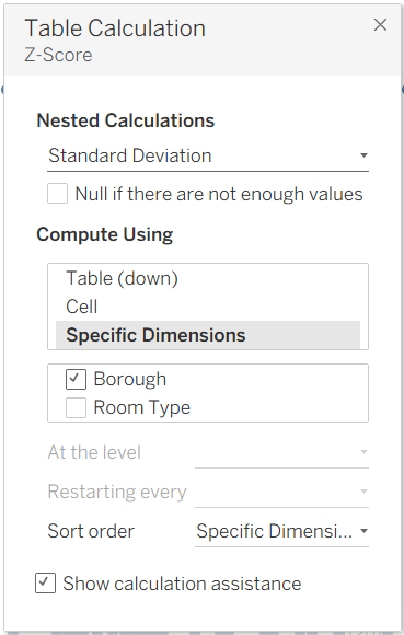 As the Z-Score is using table calculations, it is worth checking the table calculation to make sure its being calculated at the correct level by right clicking the green pill and selecting edit calculation. As we are comparing Boroughs for each room type we want to make sure Borough is selected in specific dimensions for both the Standard Deviation and Mean calculations.