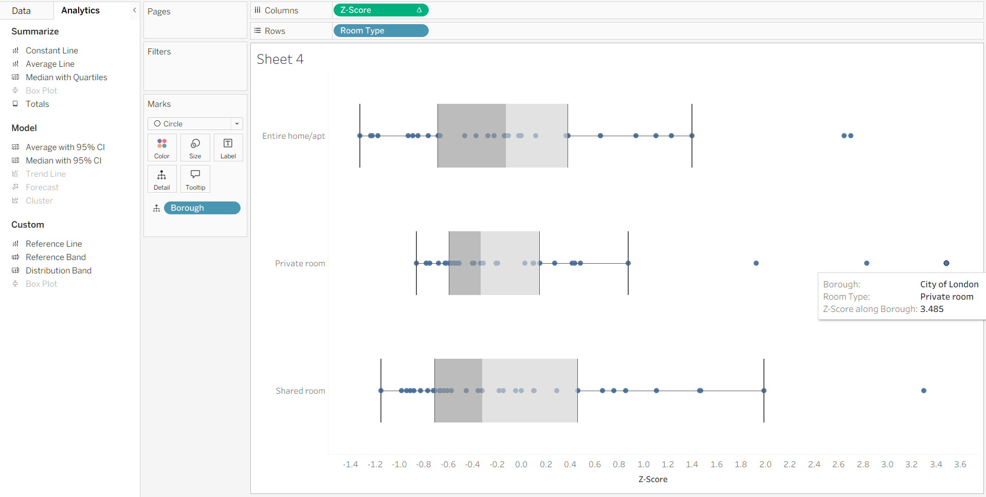 Then to add the boxplot, simply drag box plot from the analytics pane onto the sheet. The chart below shows us that a private room in the City of London is significantly higher compared to the mean of all private rooms.