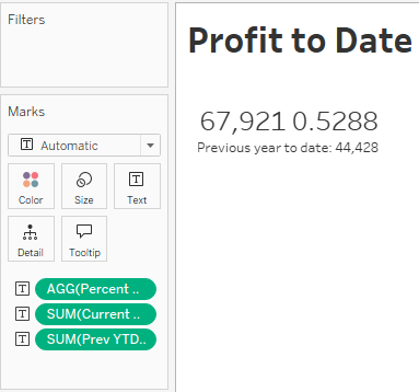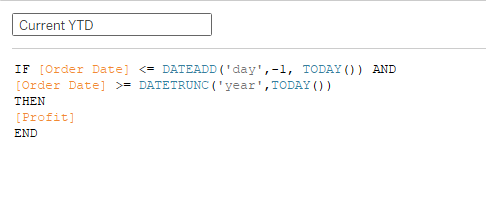 This requires us to create a calculated field that returns profit for dates ranging from the start of the year to the current day. We can easily get today's date using the TODAY() function, if you'd rather have "Today" be a variable then you can also use a date parameter instead.
