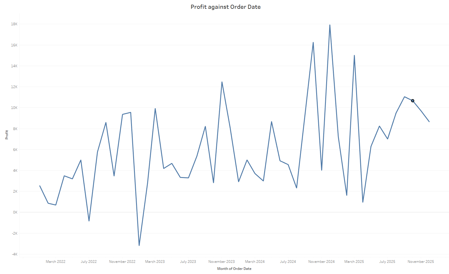 Within Superstore, we have several different measures we can choose from for KPIs. In this example, we will use SUM(Profit), as seen plotted against Order Date below.