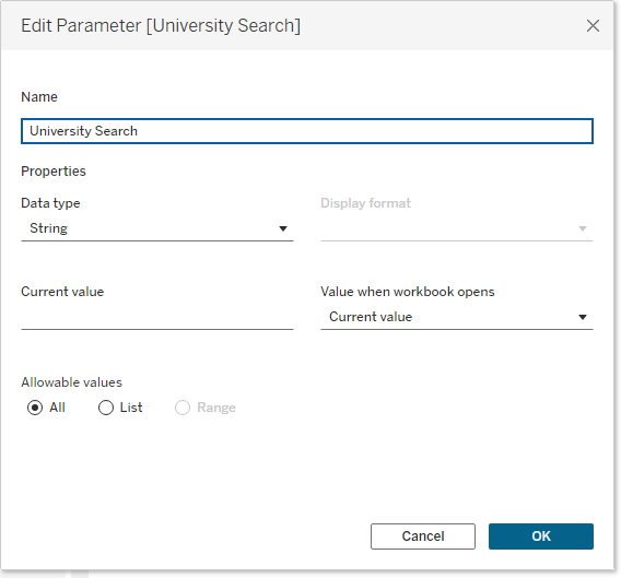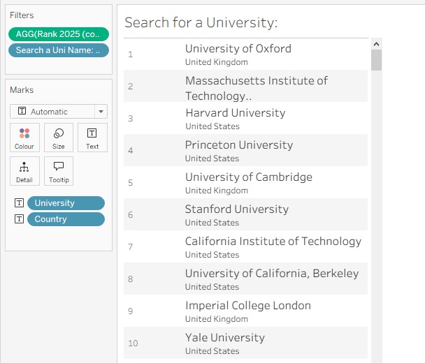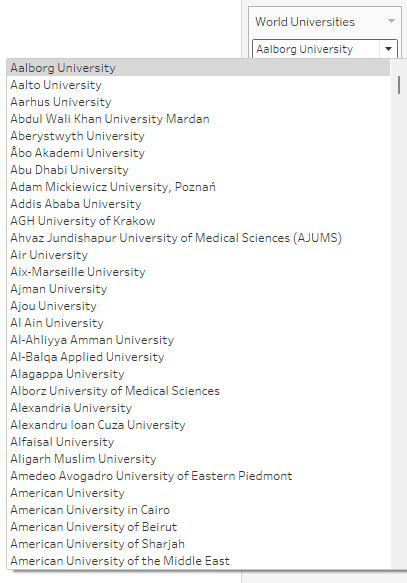 This technique uses parameters which, in Tableau, are user defined variables that can be used to change the view. In this example, there are hundreds of universities in our list, making it quite tedious to scroll through and find the one you are looking for. Luckily, with a couple of sheets and a formula, we can implement a search bar to improve the user experience.