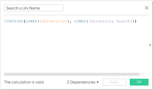 CONTAINS([String], [Substring]) - This searches a string for a substring. In this case we want to search our [University] field that contains the full name of all the institutions in the dataset against or [University Search] parameter.
