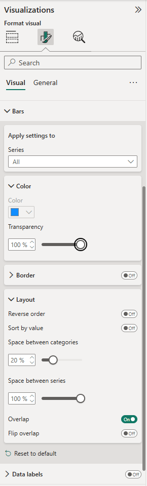 Next, the bars need to be stacked directly on top of each other. This can be done in the "layout" dropdown underneath "bars" in format your visual.