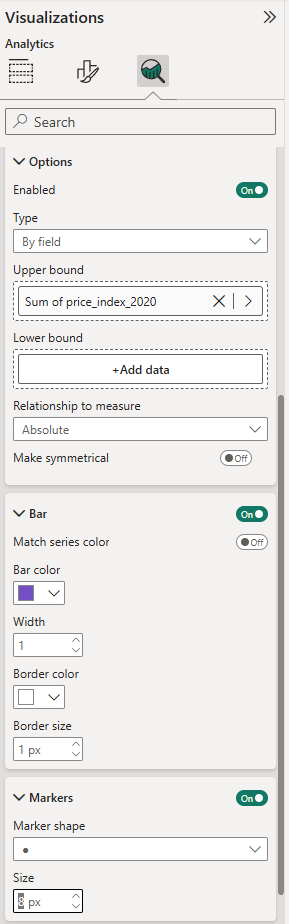 Now the trick comes in, we can create the dots of the dumbell chart by creating error bars that start and end at our different price) index fields. Starting with the price_index_2015 series, set the upper bound to "Sum of price_index_2025" by dragging in the price_index_2025 field. Then set the lower bound to "Sum of price index 2015. This creates bars spanning the difference between these fields, and will serve as the line of our dumbell chart.