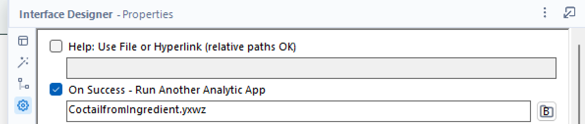 Firstly, it is important to know that there are different ways to link two apps, here we will use the output of the first app to populate a dropdown at the start of the second app. The first thing we want is to make sure our second app runs straight after the first one. To do this you will need to open the interface designer window, select properties and tick this box: On success - Run another analytic app. Then you just select your second analytic app.