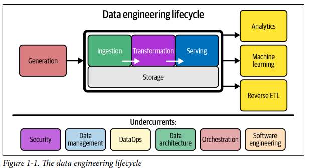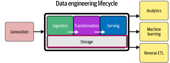 The data engineering lifecycle includes 5 stages: generation, ingestion, transformation, serving, and storage. Understanding this process, I know how the data moved from the source system to the endpoint. Depending on the complexity and the cost of the organization, the data engineer can choose the best way to proceed for each stage.
