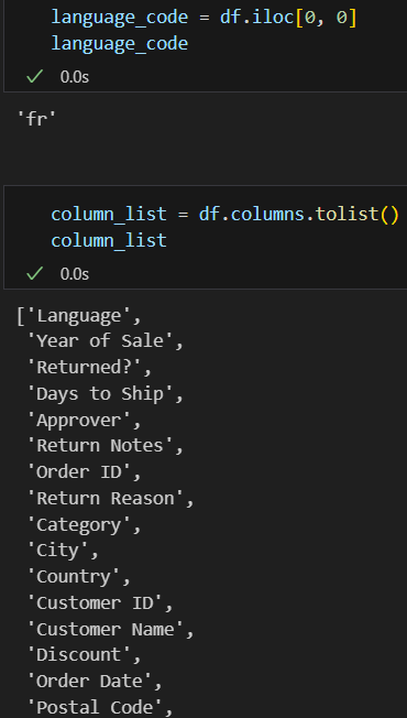 After I got the language code and the list of column names, and stored them in variables language_code and column_list.