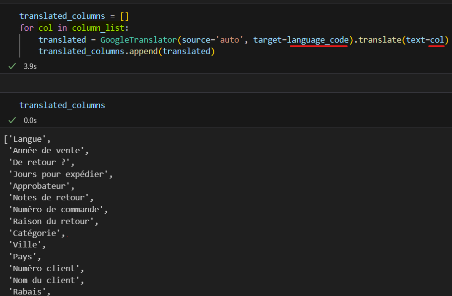 In the next step, I initialized an empty list (translated_columns) to store all translated column names. Then, iterate over each value in the column_list. I called the GoogleTranslator method and passed 2 arguments (source and target). The source is set to auto to auto-detect the language. The target is the language code that we want to translate to. I put the language_code that we did above.
