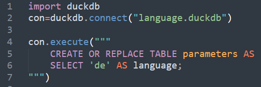I created a new Python file called duckdb_input.py. In this file, I created a connection to the duckdb. It will create a table parameter with an initialized value "de" for the language. Save it. Then, run this Python file in the terminal.