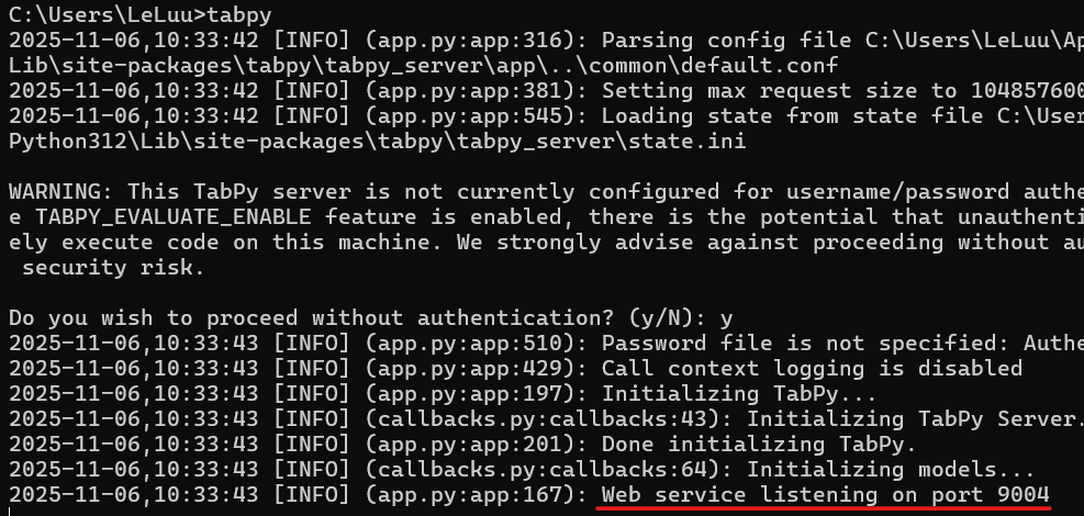 Now, activate tabpy in the terminal by typing tabpy. Make sure that the service is listening on port (by default, the port number is 9004 for localhost).